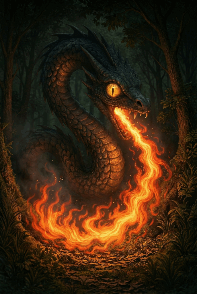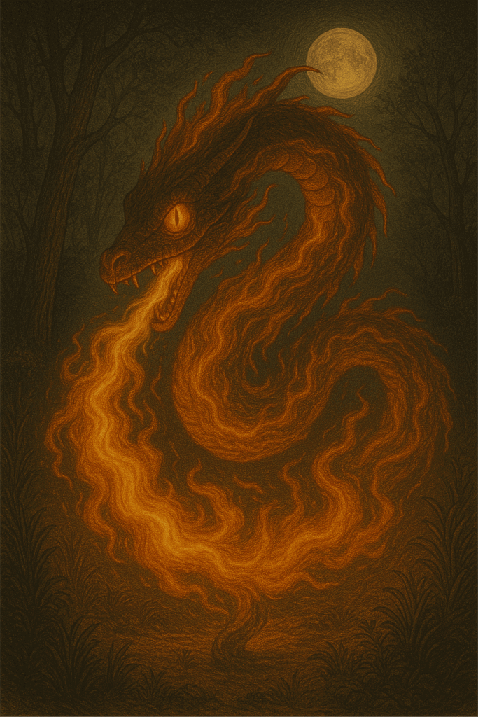 O Boitatá é uma serpente de fogo do folclore brasileiro, guardiã das matas e protetora da natureza. Sua presença costuma aparecer como um rastro luminoso que serpenteia pela noite.