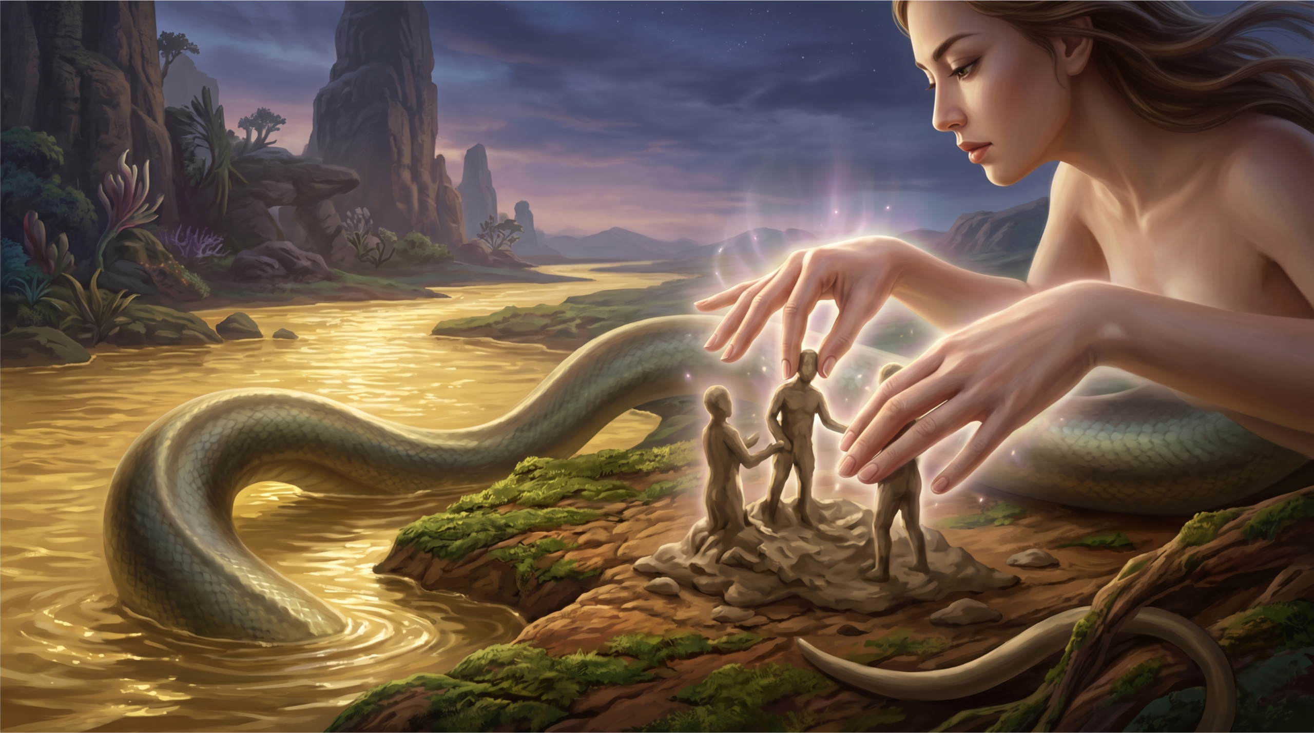 • Nuwa, a Criadora da Humanidade: Após a morte de Pangu, a deusa Nuwa sentiu-se solitária. À beira do Rio Amarelo, ela começou a moldar figuras de barro amarelo com suas mãos. Aqueles que ela moldou cuidadosamente tornaram-se os nobres, enquanto os humanos criados de respingos de lama espalhados por uma corda tornaram-se o povo comum.