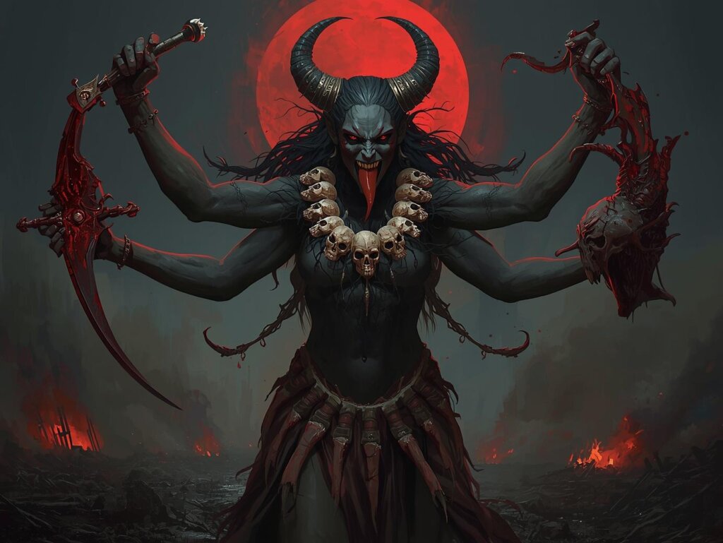- Kali: A face aterrorizante da justiça e da destruição do ego. Com sua pele escura e colar de crânios, ela representa o tempo que consome todas as coisas, mas também a proteção materna feroz.