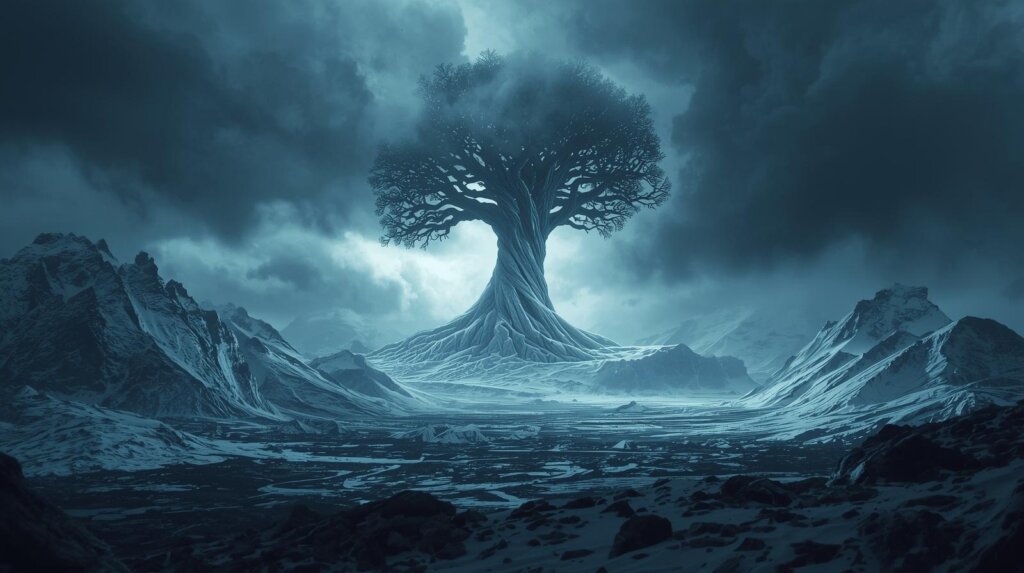 Yggdrasil: A Árvore do Mundo. Um freixo colossal cujas raízes e galhos conectam os Nove Reinos da existência (como Asgard, Midgard e Jotunheim).
