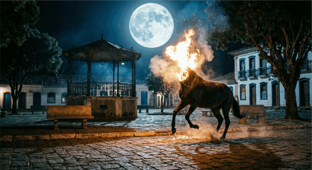 Quando deu meia-noite, o sino da igreja bateu sozinho. Ninguém puxou corda nenhuma. O badalo bateu seco, ecoando no vale. Nesse mesmo instante, veio um cheiro ruim, de enxofre misturado com carne chamuscada. E junto com o cheiro, o barulho dos cascos no calçamento: tloc-tloc… tloc-tloc…