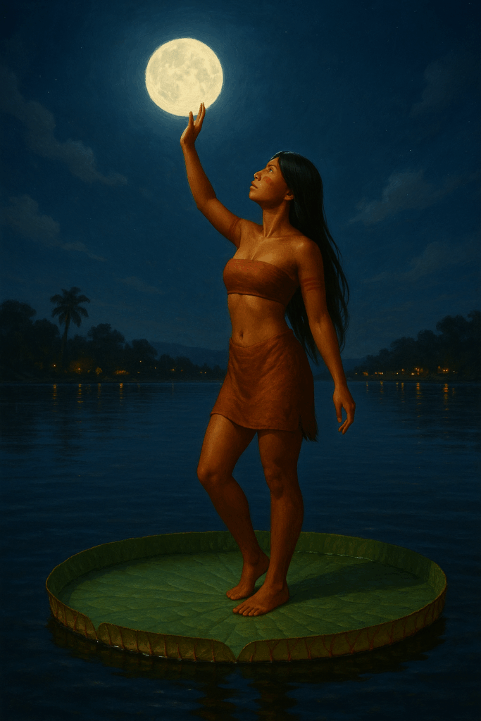 A pobre moça, cega pelo desejo, achou que Jaci tinha descido para se banhar. Ela não viu a água fria. Ela não viu a lama funda. Ela só viu o brilho.